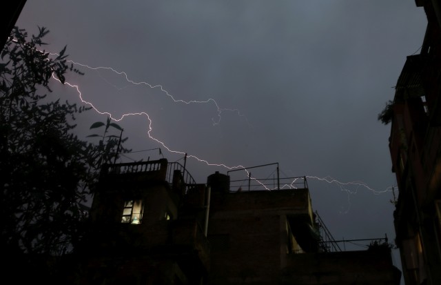 Lightning strikes over houses