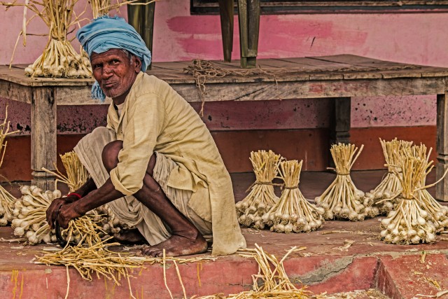 Farmer making bunches of garlic.